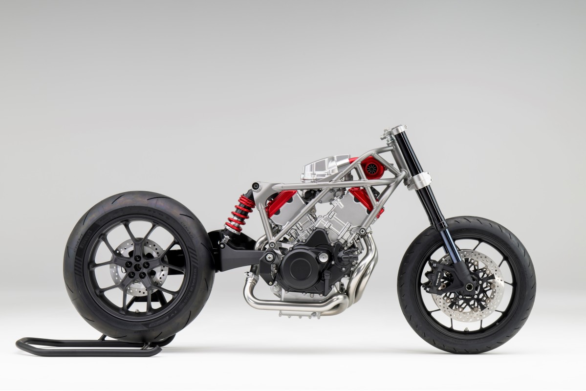 All previous V3 engines through history have been two-stroke. Honda’s latest creation is a liquid-cooled four-stroke, with a 75-degree angle between cylinder banks and a claimed capacity of 900cc. But what really stands out is the incorporation of forced induction, something rarely seen on motorcycles.