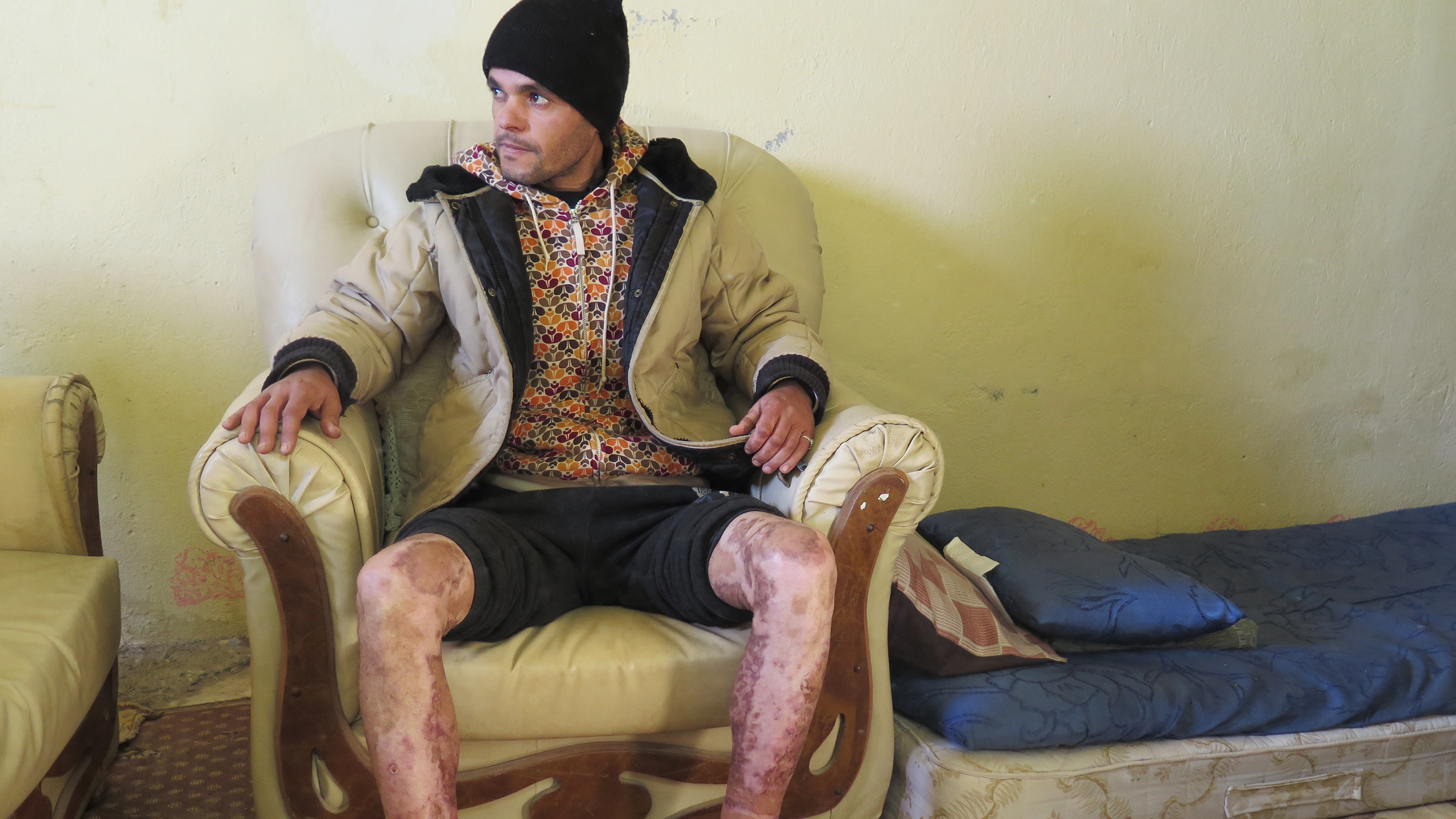 Back at his home, in a simple living room, which is also where Ferid sleeps, he rolls up his pants to reveal legs covered in skin grafts and scars. Walking can be painful, and the skin is not fully healed in some places. He needs bandages for his legs, but says he can’t afford to buy them.
